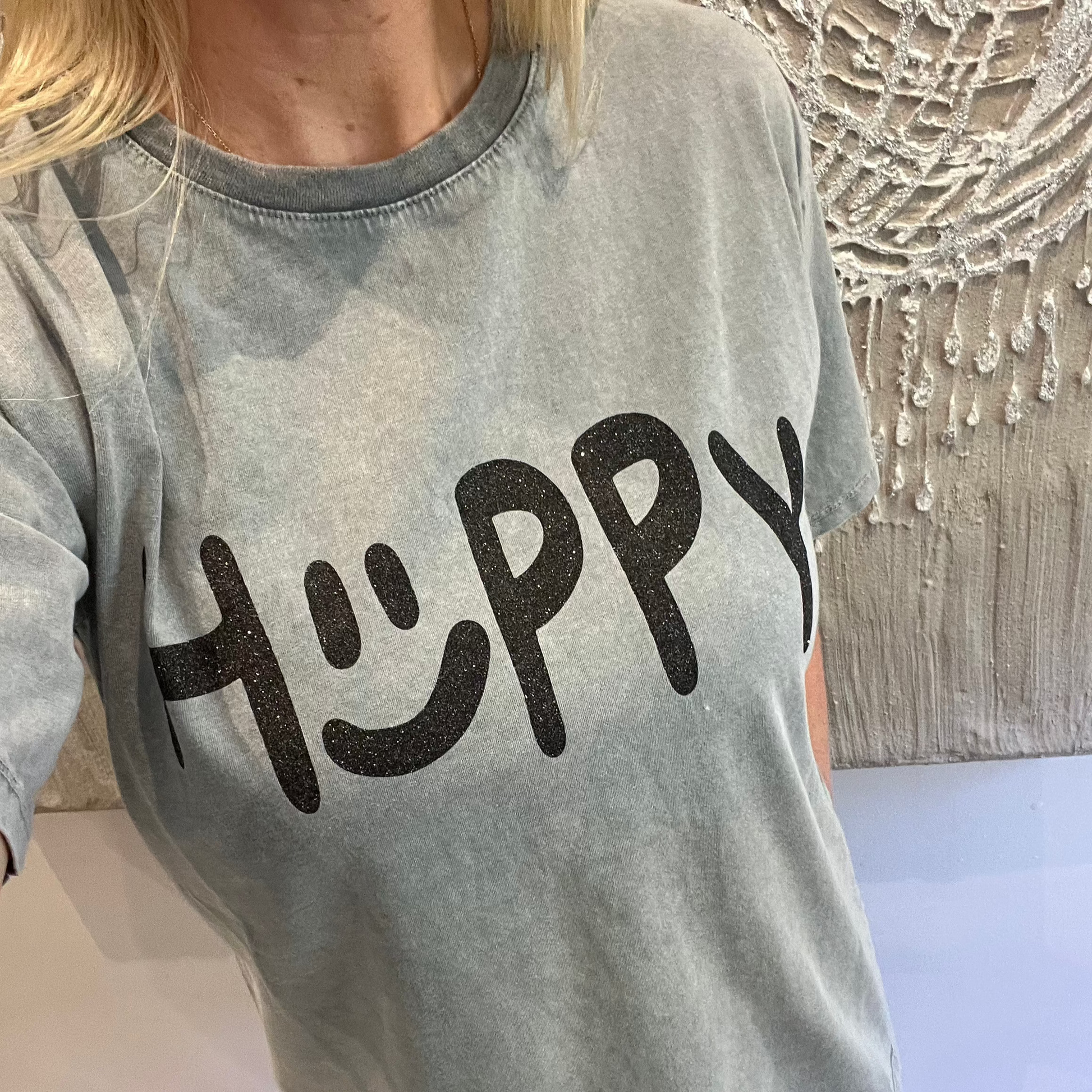 Versatile Happy T-Shirt offered in sophisticated Charcoal Grey or crisp White. The one-size design features a relaxed fit suitable for various body types. Crafted for everyday wear, this essential piece combines simplicity with understated style, making it an effortless addition to any wardrobe.